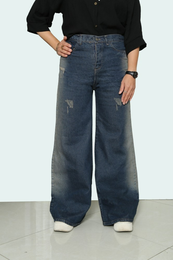شلوار جین مدل واید لگ سورمه ای کثیف شور