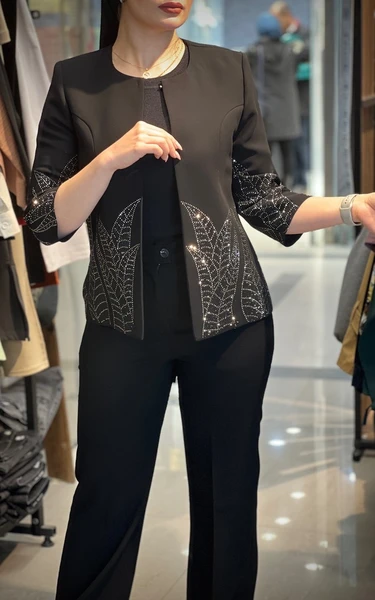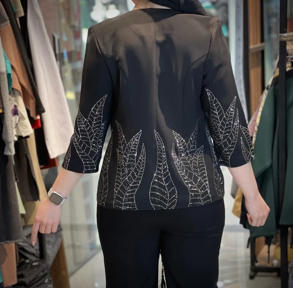 جنس: کرپ مرویجت مشکی زاغ استین سه ربع قد استین از سرشانه: 45 قد کت: 62 سایز بزرگ نگین کوب (نگین ها به هیچ عنوان ریزش ندارند.)