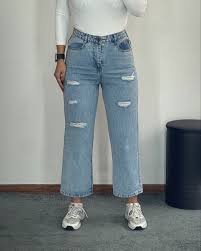 شلوار جین مدل واید لگ ابی برفی زاپدار