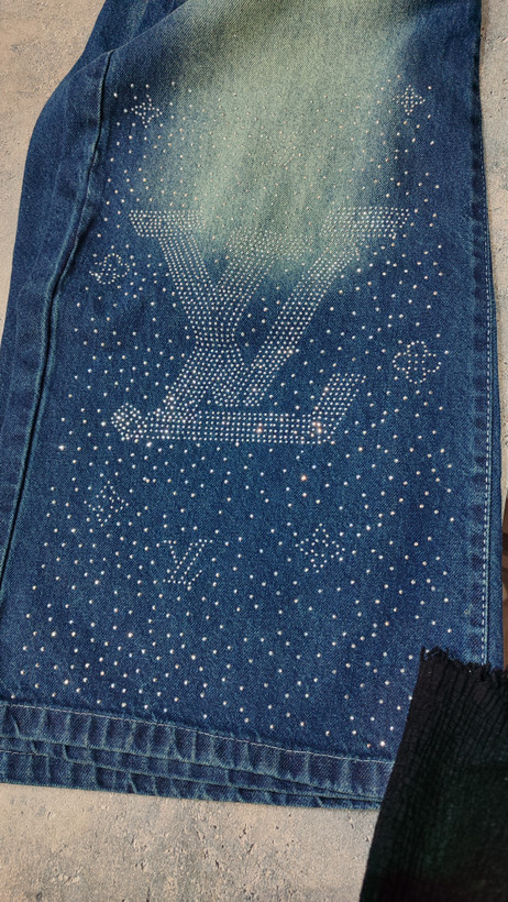 شلوار جین دخترانه مدل بگ نگین دار آبی تیره با تینت سبز وارداتی
